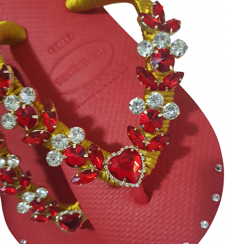 Las Chanclas Havaianas Akari fusionan el confort clásico de Havaianas con un diseño llamativo y artesanal. De color coral, sus tiras envueltas en hilo dorado están adornadas con pedrería roja, hojas decorativas y flores de cristal que aportan un toque de lujo. Cada par es elaborado a mano, pensado para quienes buscan comodidad sin renunciar al estilo. Ideales para paseos, vacaciones o reuniones informales.